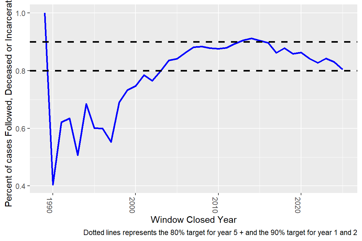 There are 82781 possible followups in the data set. Of those 84% percent were followed successfully (87% if you include centers who had no funding for followup)